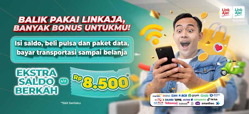 10.Ketentuan Promo ini sudah disesuaikan dengan prinsip syariah. Promo berasal dari biaya promosi LinkAja dan bukan saldo pelanggan yang diberikan dengan Akad Hadiah kepada pelanggan.