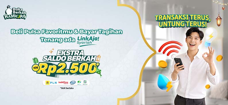 - Ekstra Saldo Berkah s.d. Rp1,500 untuk pembayaran tagihan (PLN, Indihome, PDAM, BPJS) di LinkAja.