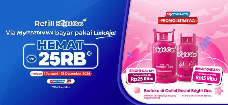 Promo spesial refill tabung Bright Gas 5,5 Kg dan Bright Gas 12 Kg di SPBU Pertamina atau Outlet resmi Bright Gas minimal transaksi Rp90.000,- dengan metode pembayaran LinkAja, berkesempatan mendapatkan cashback hingga maksimal Rp25.000,- . Jangan sampai kelewatan promo menariknya, refill Bright Gas lebih hemat tiap bulan pakai MyPertamina! Promo ini berlaku sampai dengan 31 Desember 2026.